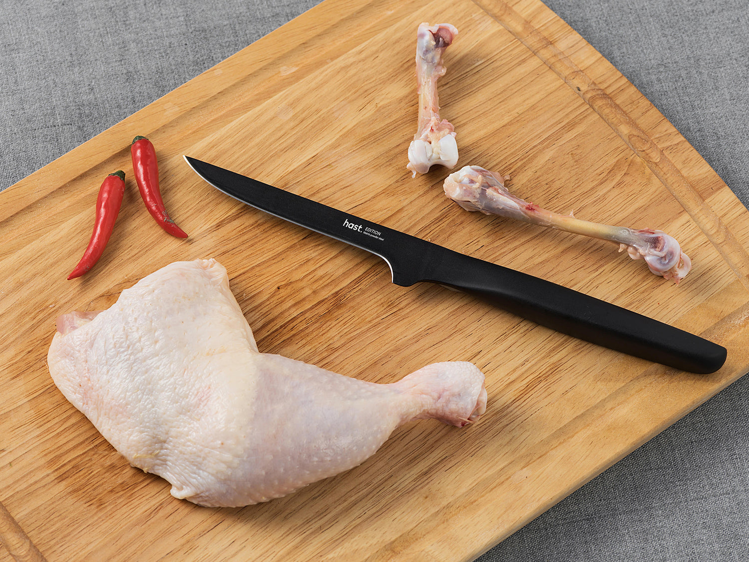 Soft edges, polished lines, and a rounded knife heel make the Hast boning knife comfortable and natural in your hand. The ergonomic handle feels like an extension of you and makes a beautiful gift for those who love to cook and carve meat. The Hast boning knife stands out in minimalist premium packaging.