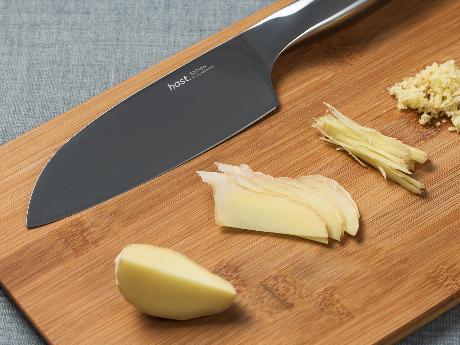 Soft edges, polished lines, and a rounded knife heel makes Hast Santoku knives comfortable and natural in your hand. The rounded tip and the flat blade edge makes the Santoku knife even more playful and user friendly than our Chef’s Knife. A beautiful gift for any foodie or professional, our Santoku knife stands out in compact, premium packaging.
