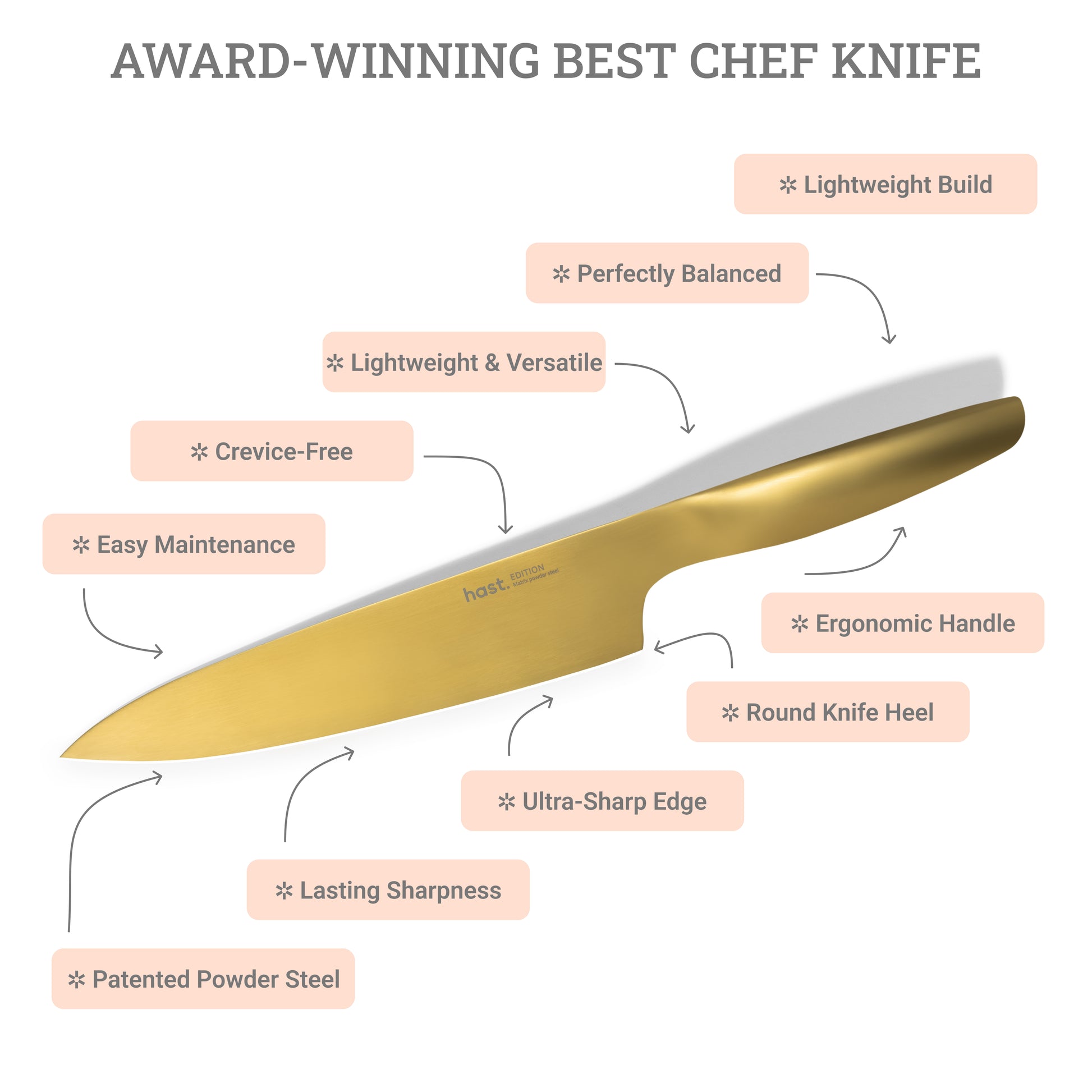 Engineered to deliver the perfect cut every time, Hast knives let you have more control and creative freedom. Sleek and keen, our 8” powder steel Chef’s Knife is twice as sharp as well-known premium brands.