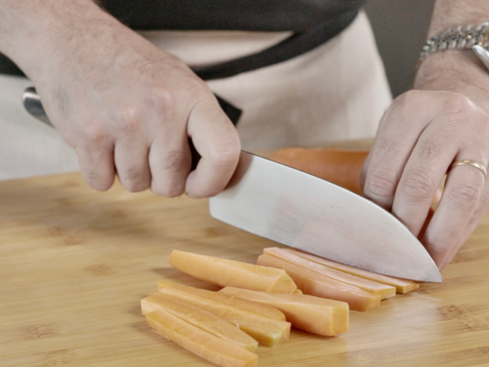 The Hast Selection Japanese carbon steel 6.3” Santoku knife is another must-have. It has a shorter blade and a flatter edge than the 8" Chef’s Knife, making it easy and more playful. It’s the perfect knife for cutting thinner slices of protein, like fish, or for julienning vegetables.