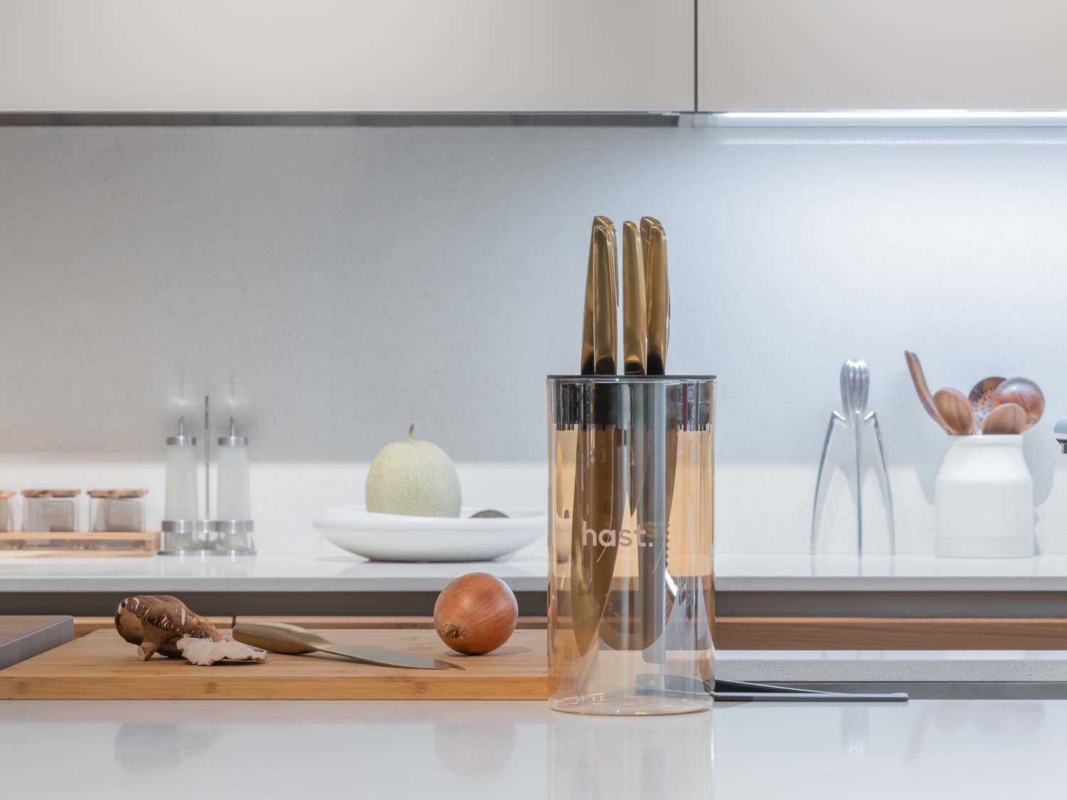 The Hast glass knife block is easy to clean and dries quickly, leaving no wet corners for stains, germs, and bacteria to develop. Meal prep every day with easy care knives that stay hygienic.