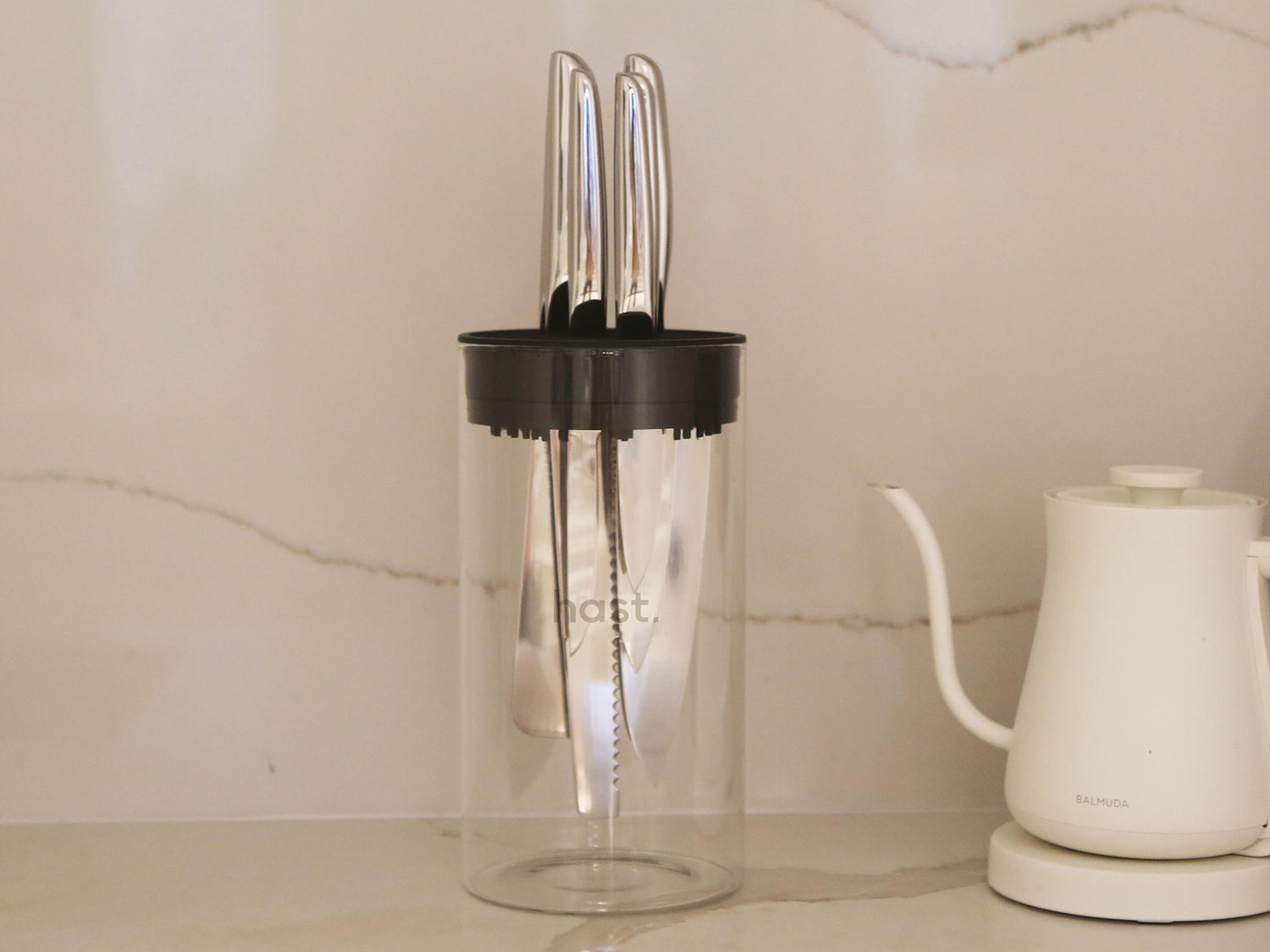 This glass knife block is part of the 7 Piece Minimalist Kitchen Knife Set.